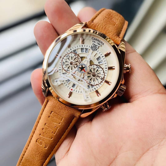 Tag Heuer Carrera Caliber Eiffel Tower Edition TAG-IT-1242 Tan Color Leather Chronograph White Dial And Gold Case Leather Wrist Watch Men's Watch For Man Gift