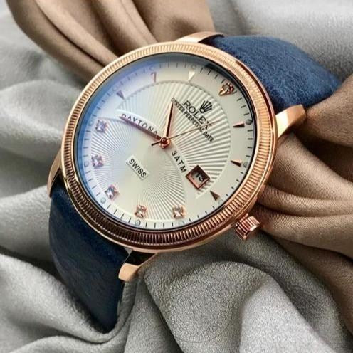 RLX DayTona 3ATM Swiss Dark Blue Leather Men's Watch For Man RLX-3-09 White Dial Gold Case Date Gift Watch