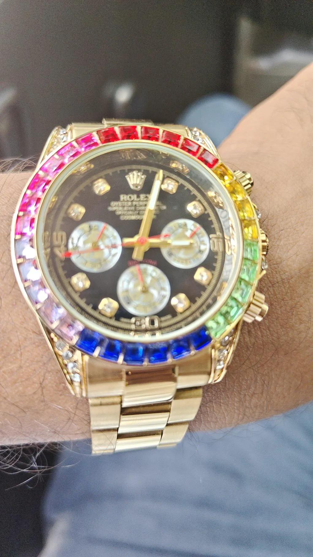 Multi Color Chronograph Men's Watch With Dual Tone Stainless Steel Strap, Diamond Case, Rainbow Color